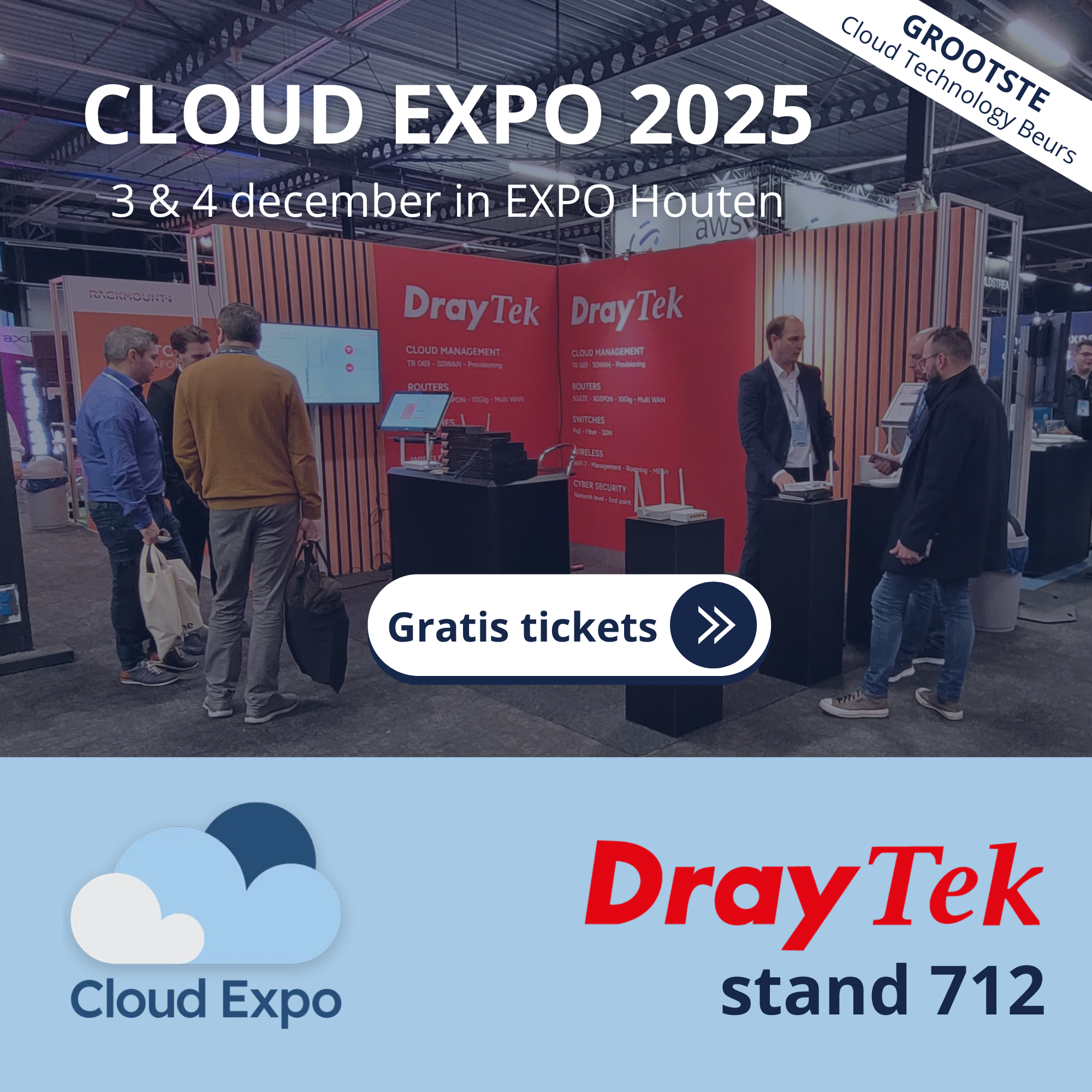 29-10-25On Wednesday, December 3rd and Thursday, December 4th, we'll be at Cloud Expo 2025 in Expo Houten with DrayTek; the largest IT trade show in the Netherlands where cloud, data, AI, and security converge. Discover the latest DrayTek cybersecurity solutions and talk to our team about the future of connectivity. Admission is free, so register now!